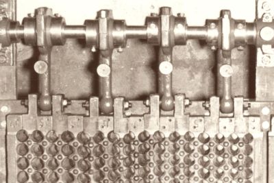 In 1932, a new, larger almond craker and sheller was patented. In 1935, a new eccentric shaft system was also patented that eliminated vibrations and significantly improved the performance of the machine.